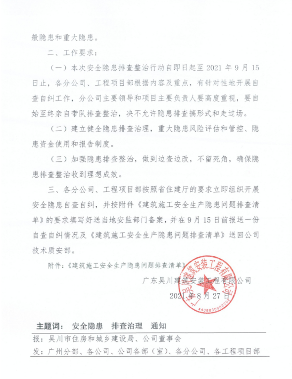 一、根據(jù)省、市住建主管部門(mén)關(guān)于全面開(kāi)展建筑施工安全生產(chǎn)隱患排查治理的通知要求,公司董事會(huì)要求各分公司、工程項(xiàng)目部從即日起對(duì)在建工地開(kāi)展建筑施工安全生產(chǎn)隱患排查治理行動(dòng)。