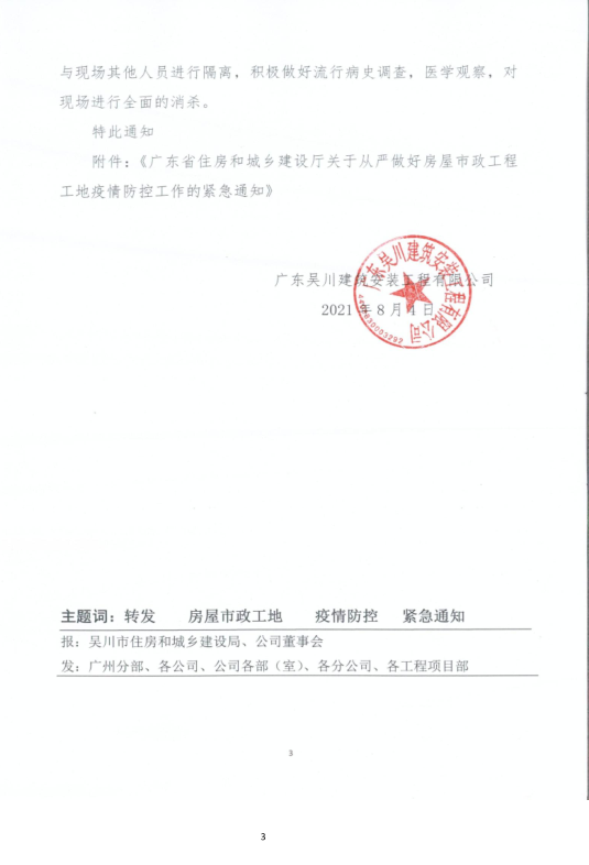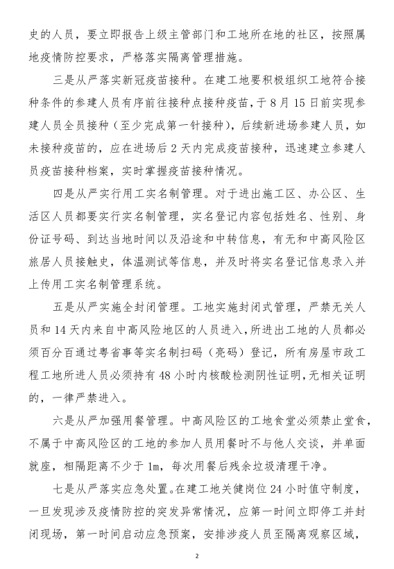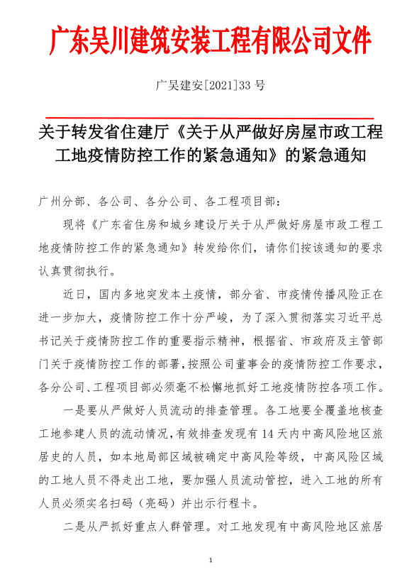 近期,國內(nèi)多地突發(fā)本土疫情,江蘇宿遷、湖北武漢等地建筑工地已出現(xiàn)新冠肺炎確診病例,疫情在工地傳播的風(fēng)險進一步加大。為深入貫徹落實習(xí)近平總書記關(guān)于疫情防控工作的重要指示精神,根據(jù)省委、省政府關(guān)于疫情防控的工作部署,按照全省疫情防控和安全生產(chǎn)電視電話會議要求,我廳決定在認(rèn)真執(zhí)行2020年2月印發(fā)的《廣東省房屋市政工程工地防控新冠肺炎疫情工作指引》的基礎(chǔ)上,對部分常態(tài)化疫情防控措施進行提檔升級,提出了以下9方面要求。請結(jié)合本地區(qū)工作實際認(rèn)真貫徹落實,毫不松懈地抓好房屋市政工程工地疫情防控各項工作。